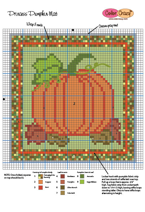 This charming Princess Pumpkin design features a super textural design with a wide frame created with 3/4"w fabric strips. Raffia accents the frame nicely and makes the design stand out. Locker hooked on 5-Mesh canvas, the yummy hand-dyed fabric strips create a warm autumn palette. Pattern includes detailed instructions and full size (13" x 19") color coded grid design for tracing. Finished mat approx. 11" x 11".